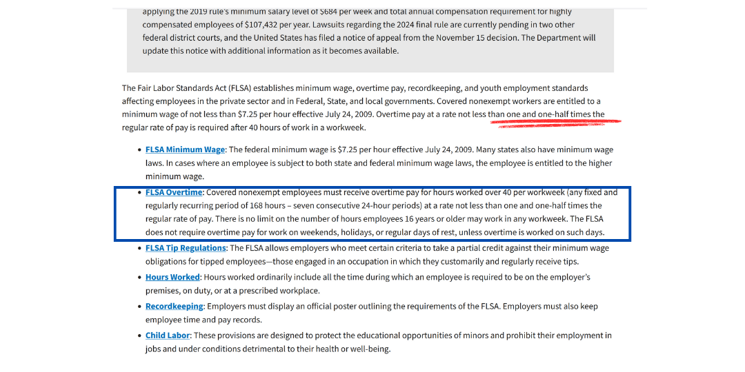 Link a la base legal: Consulte la Section 7 de la FLSA en el Departamento de Trabajo (DOL)