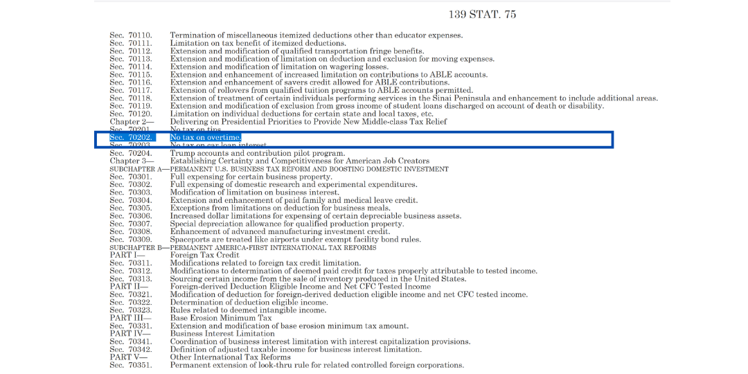 La base de todo este beneficio se encuentra en la Section 70202 de la ley OBBBA, titulada oficialmente como "No Tax on Overtime". Esta sección ordena una modificación sin precedentes al Código de Rentas Internas (IRC).